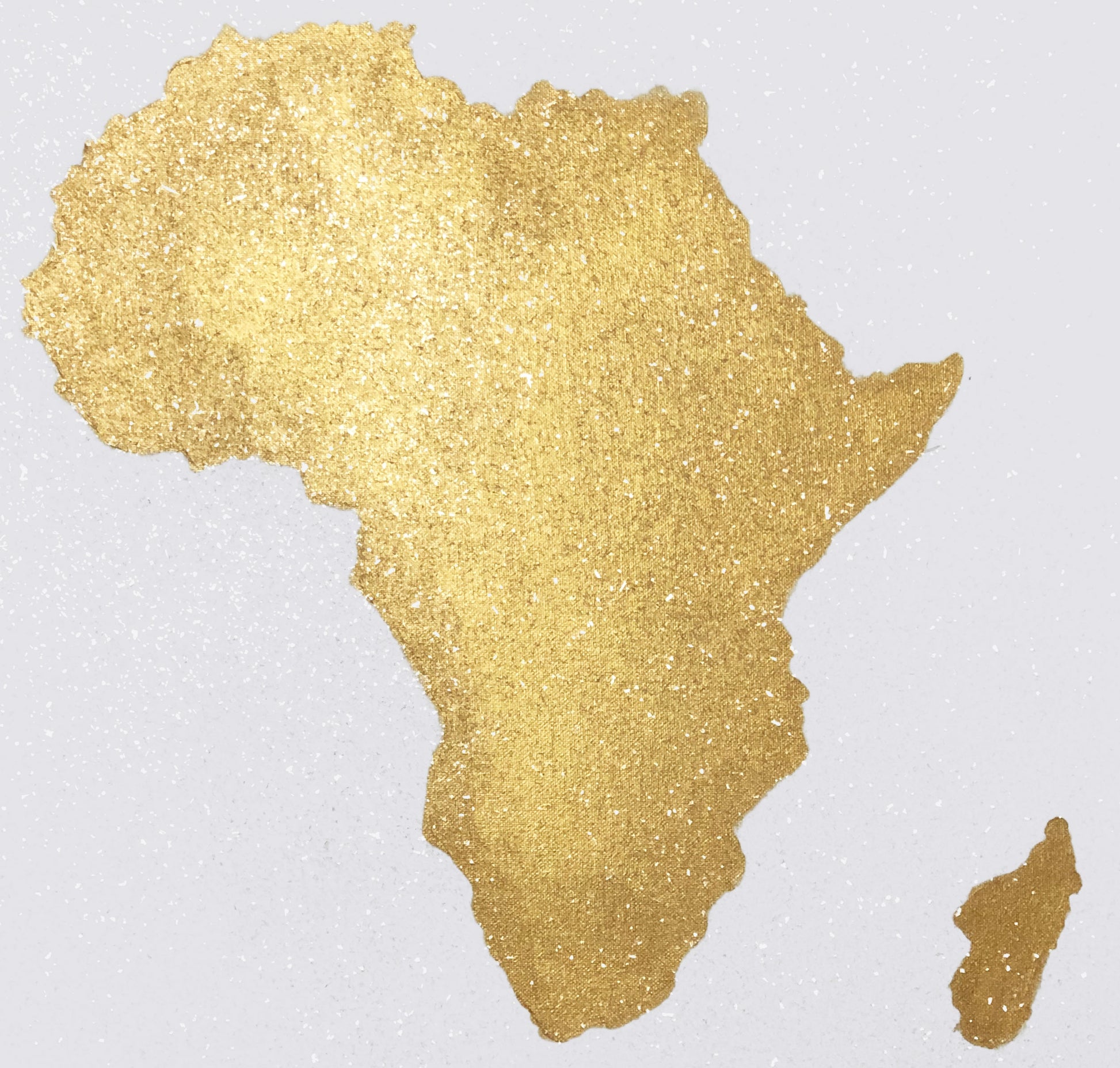 Africa is one of my favorite place and is also the center of where all things came from. Africa is painted in a metallic Gold paint on a White Background all created with finely crushed glass.